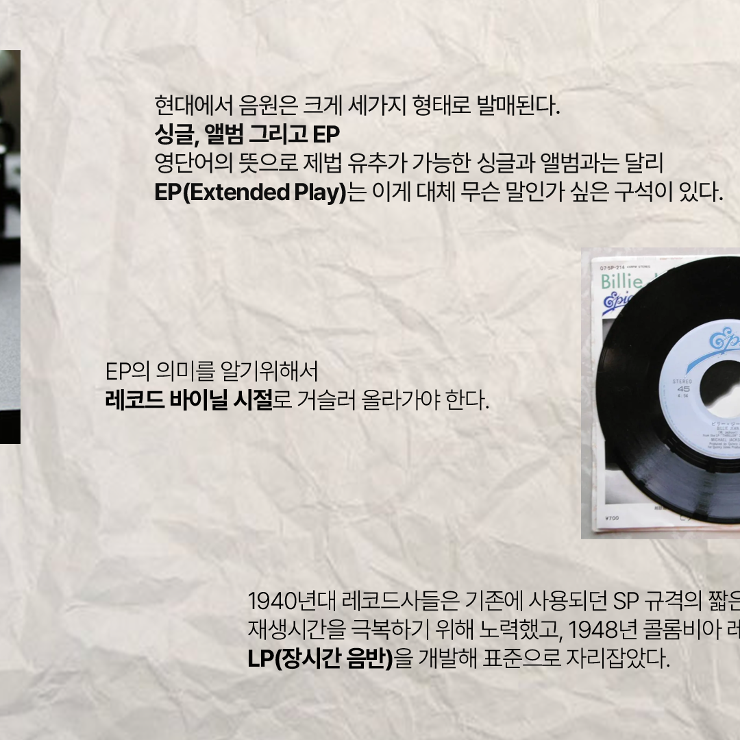 영단어의 뜻으로 제법 유추가 가능한 싱글과 앨범과는 달리 EP(Extended Play)는 이게 대체 무슨 말인가 싶은 구석이 있다.