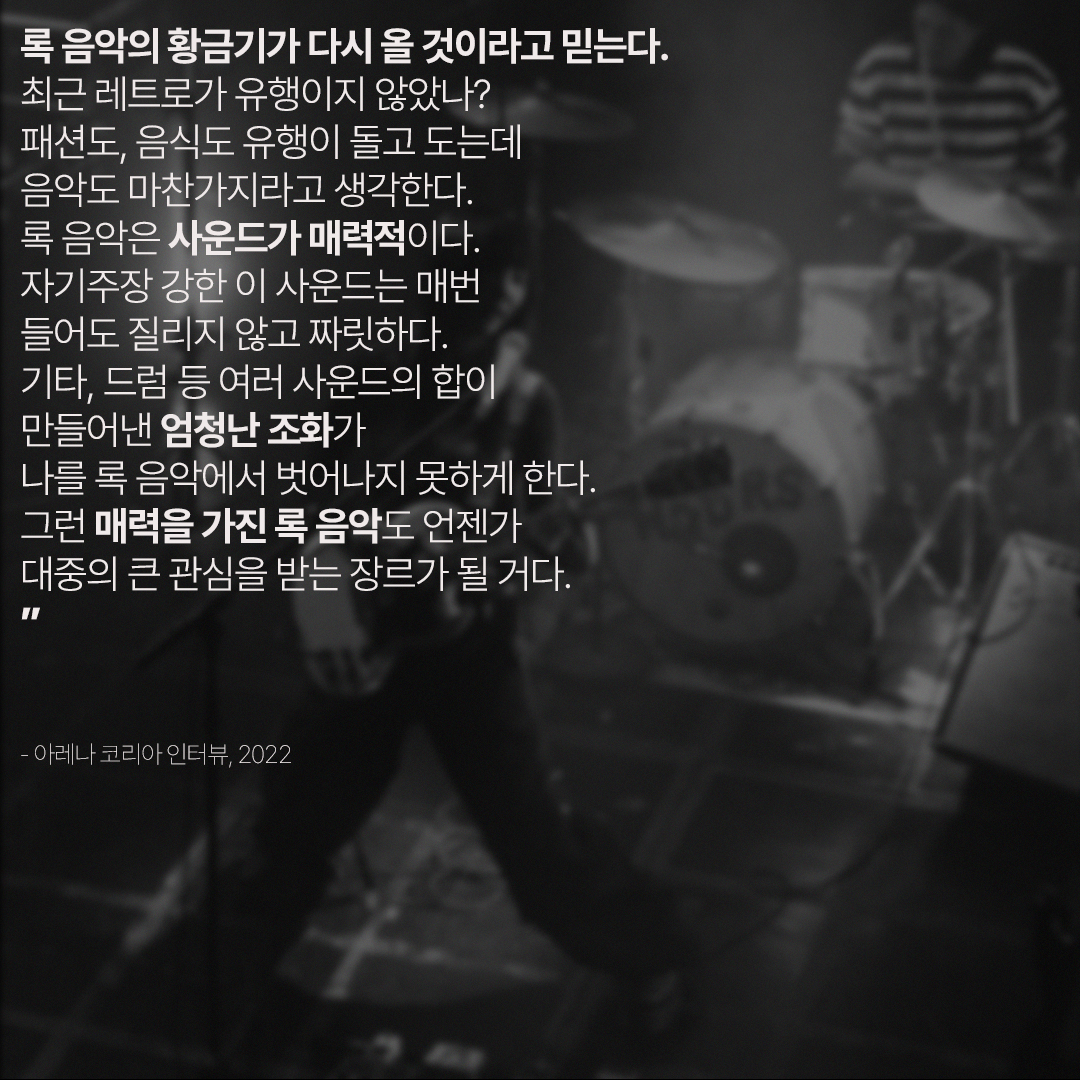 록 음악의 황금기가 다시 올 것이라고 믿는다. 최근 레트로가 유행이지 않았나? 패션도, 음식도 유행이 돌고 도는데 음악도 마찬가지라고 생각한다. 록 음악은 사운드가 매력적이다. 자기주장 강한 이 사운드는 매번 들어도 질리지 않고 짜릿하다. 기타, 드럼 등 여러 사운드의 합이 만들어낸 엄청난 조화가 나를 록 음악에서 벗어나지 못하게 한다. 그런 매력을 가진 록 음악도 언젠가 대중의 큰 관심을 받는 장르가 될 거다.