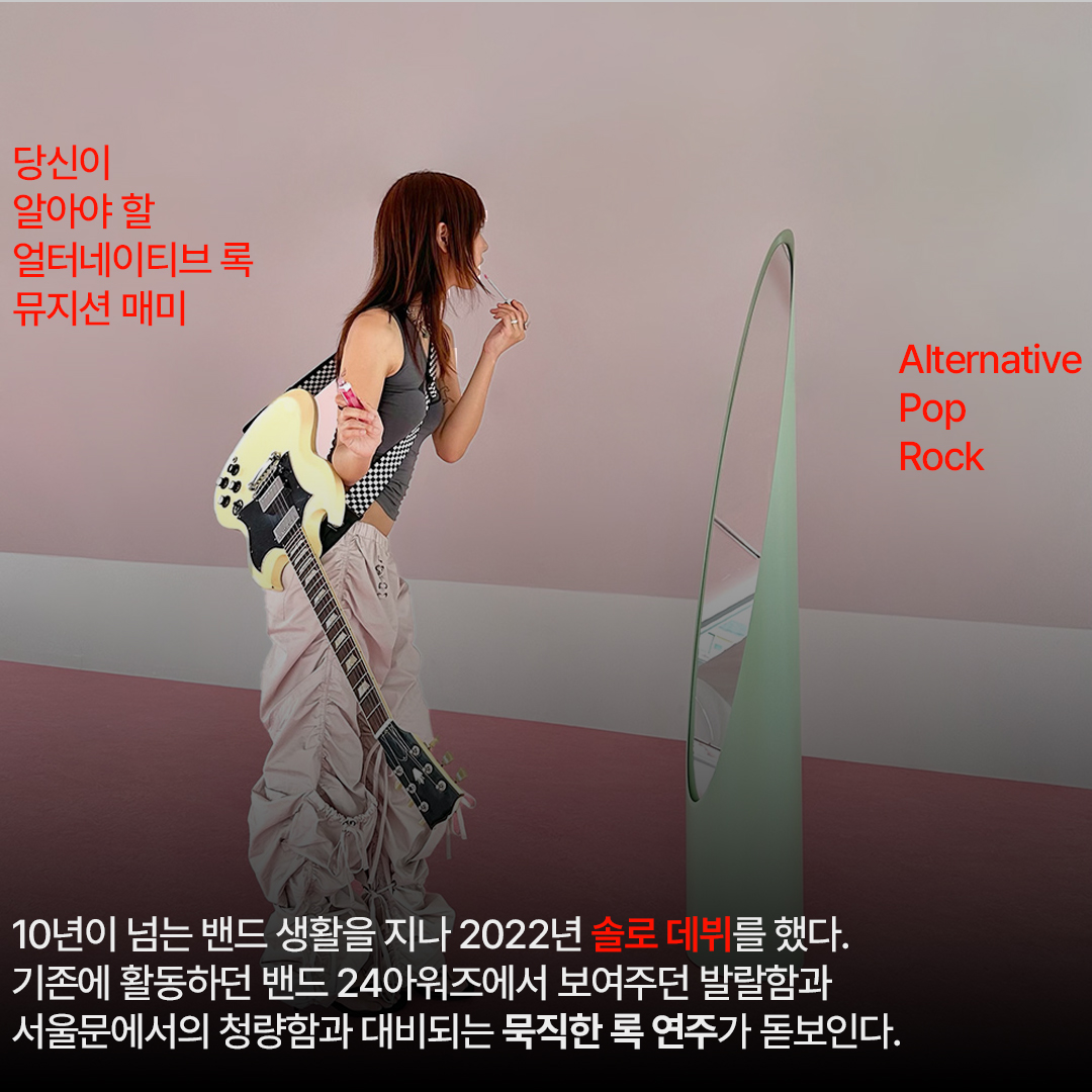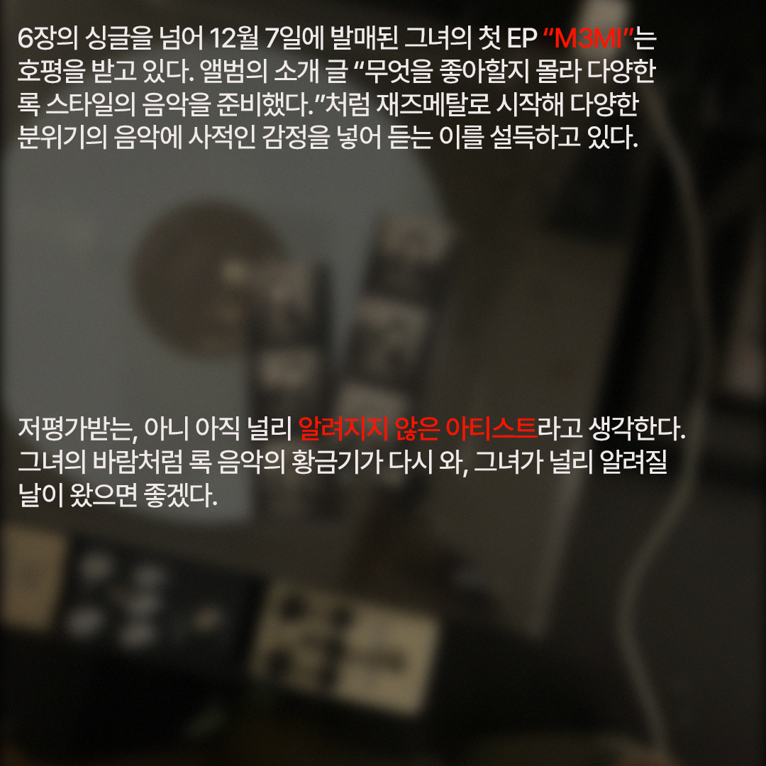 기존에 활동하던 밴드 24아워즈에서 보여주던 발랄함과 서울문에서의 청량함과 대비되는 묵직한 록 연주가 돋보인다. 6장의 싱글을 넘어 12월 7일에 발매된 그녀의 첫 EP “M3MI”는 호평을 받고 있다. 앨범의 소개 글 “무엇을 좋아할지 몰라 다양한 록 스타일의 음악을 준비했다.”처럼 재즈메탈로 시작해 다양한 분위기의 음악에 사적인 감정을 넣어 듣는 이를 설득하고 있다.